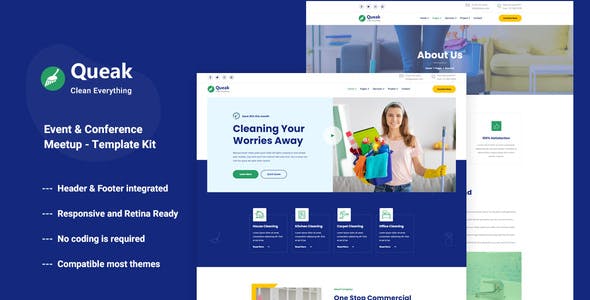 Queak is an Elementor Template Kit created especially for Cleaning Service companies like House Cleaning, Apartment Cleaners, Cleaning Company, Industry Cleaning, Office Cleaning, Housemaid Solutions. Queak Template Kit is used the popular Elementor page builder plugin, This template easily customizable, fully responsive and support all modern browser and device.