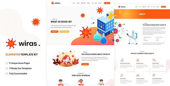 Wiras – Covid-19 Health Elementor Template Kit is specially developed for awareness of Coronavirus (COVID-19) and how to protect and prevent. This template is based on Coronavirus disease (COVID-19) and medical prevention template with the modern design. There are 2 home pages and many separate styles of the pages come with the block and section you needed. This template can be used for Medical Awareness, NGOs, Healthcare & Hospitals who all wants the people to be aware of this global pandemic of the decade.